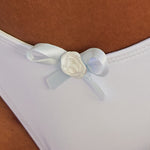 The Aya Bottoms, a classic tie side bikini, complete with a delicate baby blue bow, your bridal moment, reimagined. They feature dainty side ties, refined gold hardware, and our signature bridal swim fabric. A subtle centre-front rosette offers a nostalgic nod to traditional bridal wear, while the back serves as the perfect canvas for custom embroidery.