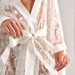 The Bardot French Lace Robe is the ultimate bridal swim coverup. Adorable floral french lace with sensuous satin edging ensures you'll make a statement on the yacht deck or in the bedroom. Personalize both ties for a truly memorable piece.