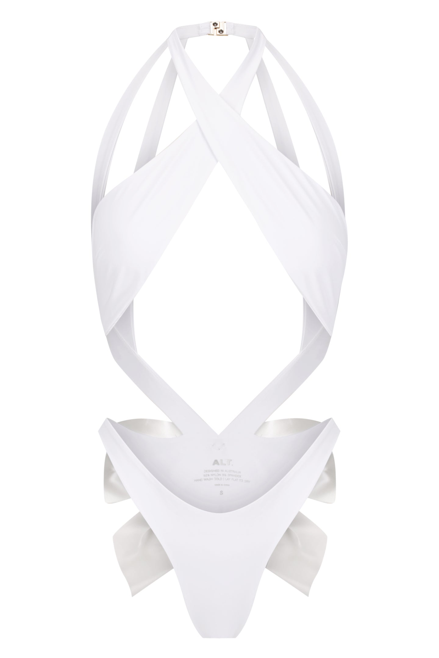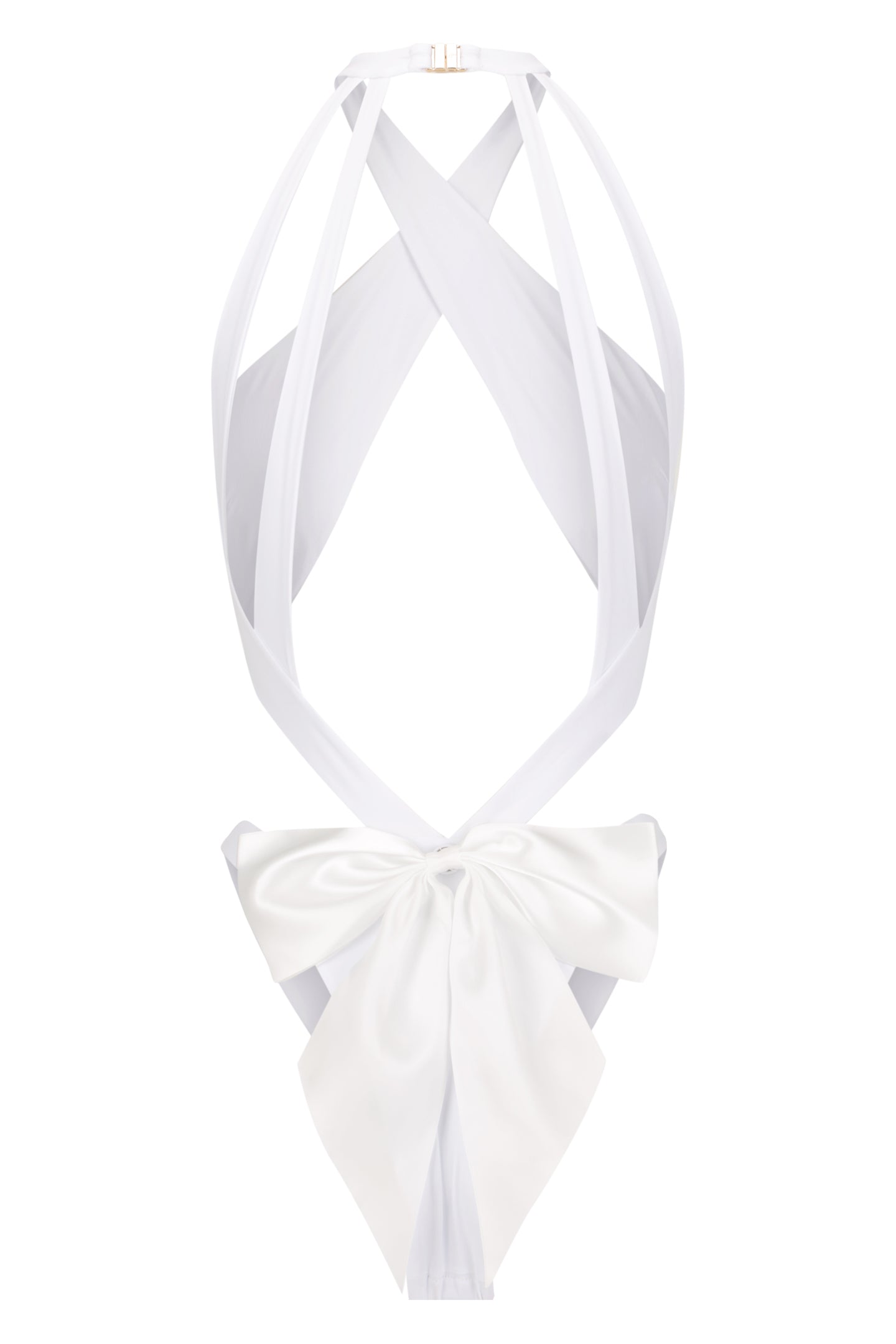 Elevate your bridal style with the limited released 'Bellisa' - The Suit of Love. A luxurious one-piece swimsuit designed to create unforgettable memories. Featuring unique back detailing, a removable bow, and a custom gold neck clip made from our signature butter soft material, this swimsuit exudes elegance and allows for personalized touches of up to 8 letters embroidered on the front of the suit. Please note due to the placement of the embroidery we can only offer a max of 8 letters.