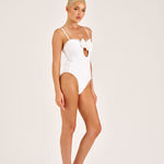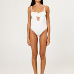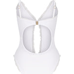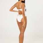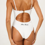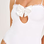 The Camilla One Piece is detailed with delicate lace trim, a statement bow, and a keyhole cut-out for a playful touch. With adjustable straps, a high-leg silhouette, and an open back, it’s a romantic take on a classic shape.