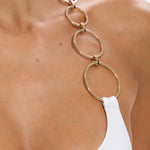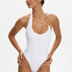 The Elidy One Piece, designed in a refined halter silhouette. Featuring oversized gold ring detailing along one shoulder, giving way to an elegant scoop neckline and a statement open back. Finished with delicate ties, this piece feels both timeless and boldly modern.
