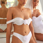 The Esra Bottoms are a minimalist silhouette with a softly ruched V-front, moderate coverage and delicate organza rosette at the centre. Designed to sit high on the hip, this style sculpts the waist while drawing attention to its feminine centrepiece.