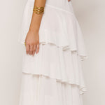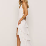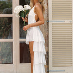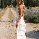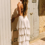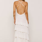 The Maribel Dress features a soft, flowing silhouette with cascading ruffle tiers and an open back framed by delicate crossover straps. Light, airy and romantic, it's designed to move with you, from welcome drinks to beach moments. The asymmetric hem adds drama and elegance from every angle.