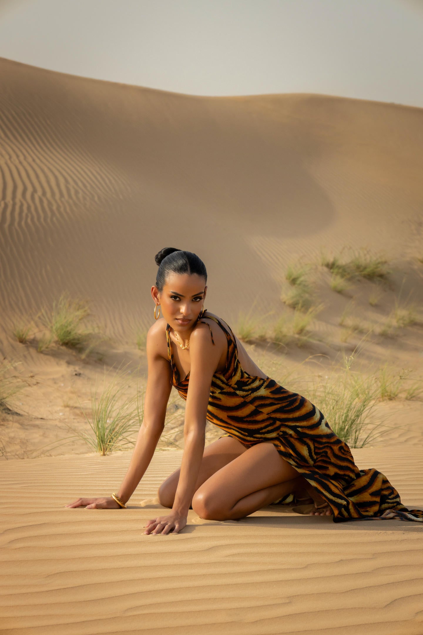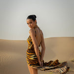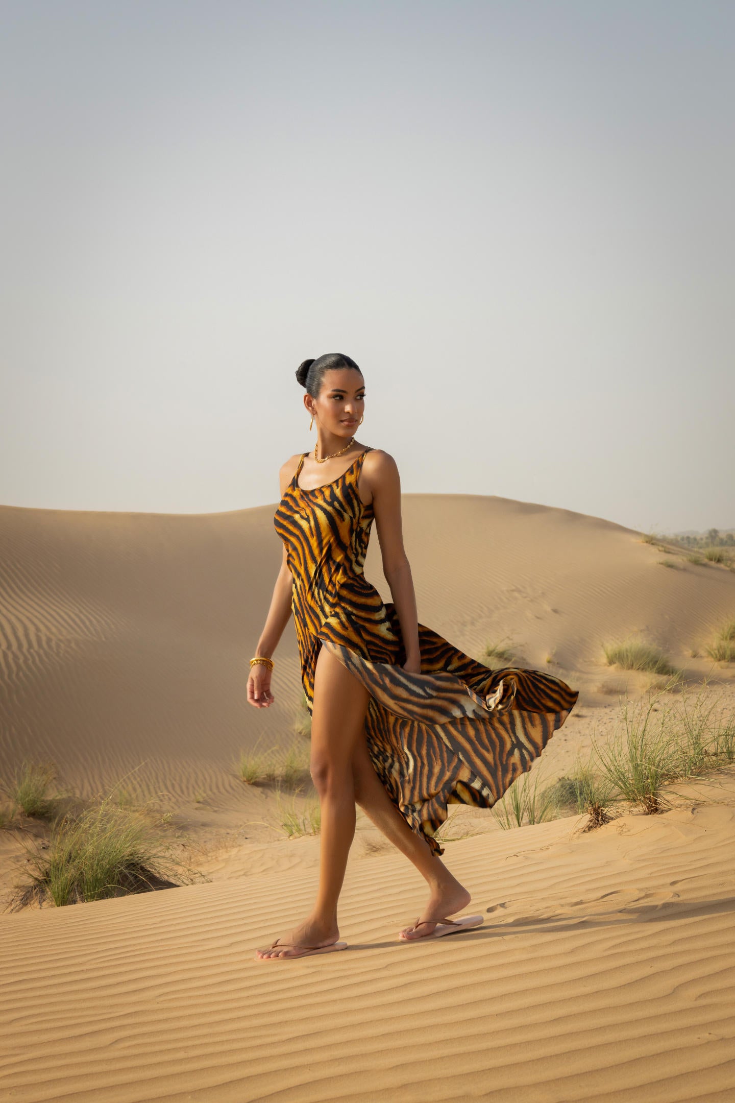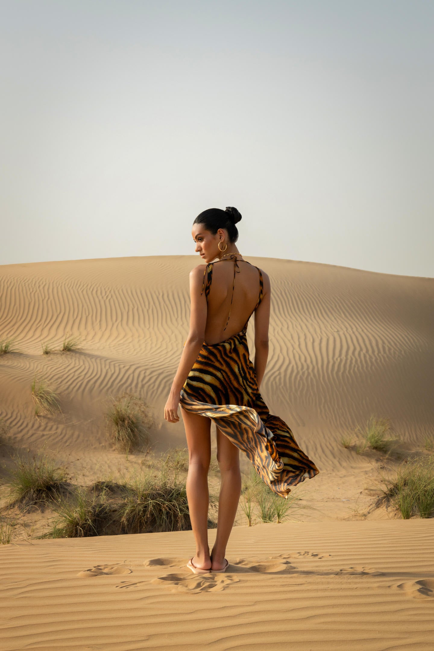 Elevate your style with our stunning Odette, a semi-sheer maxi dress in a captivating Tigress print. Designed to mesmerize with its graceful lines and intricate details, this dress transforms every step into a dance of elegance. Crafted from our all-new butter-soft material and cut on the bias, the Odette dress molds beautifully to your body, creating an exceptionally flattering draped effect.