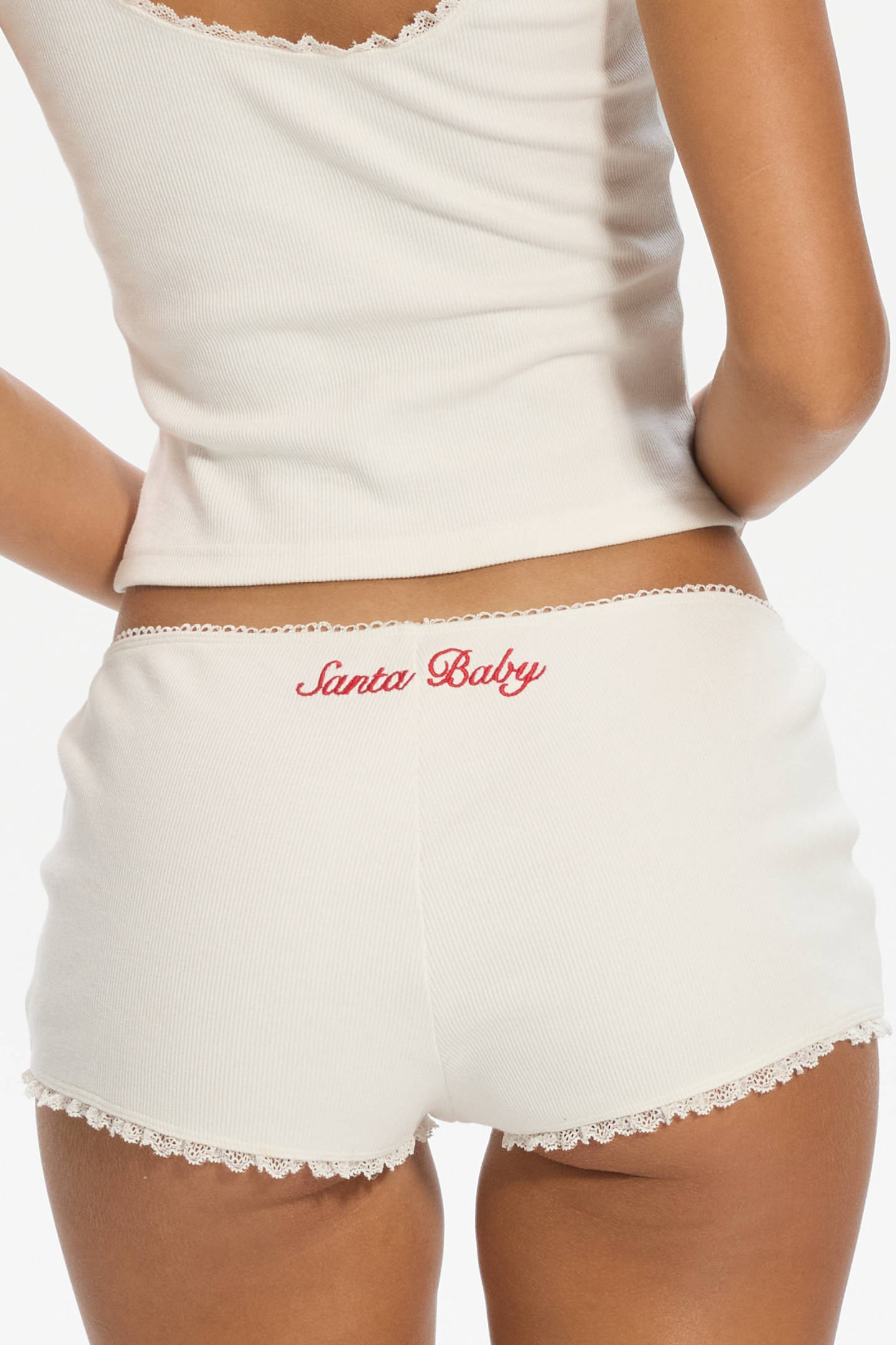 An ultra-soft stretch-cotton rib micro-lounge short with delicate lace trimming. Designed to sit low on the hips for a relaxed fit, it’s finished with a dainty satin bow at the front and complementary embroidery at the back.