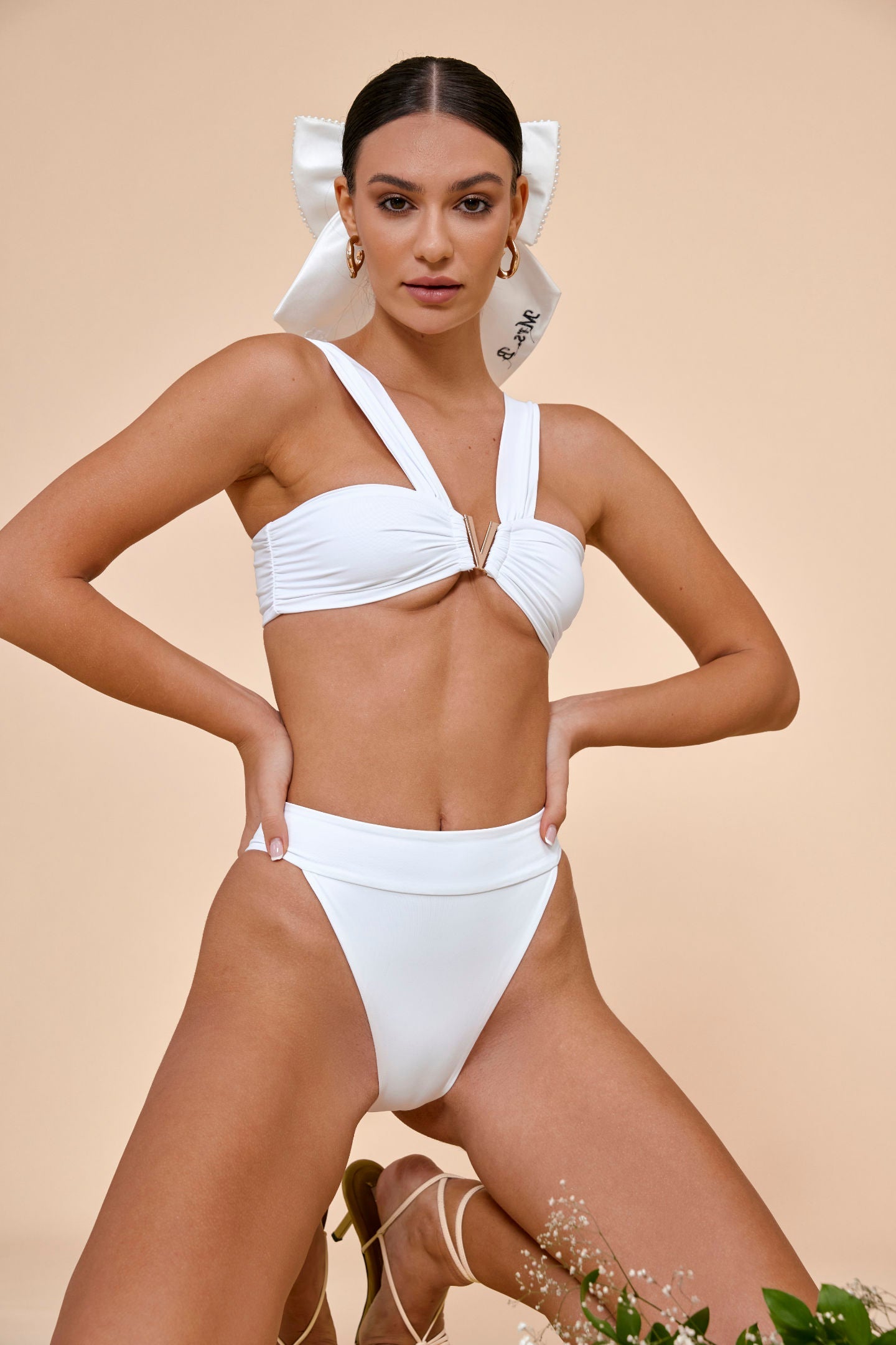 The Allera Bottom features a clean high-rise fit and a high-cut leg for a long, sculpted silhouette. With a smooth finish and space for optional embroidery, it’s a contemporary take on bridal swimwear with subtle detail.