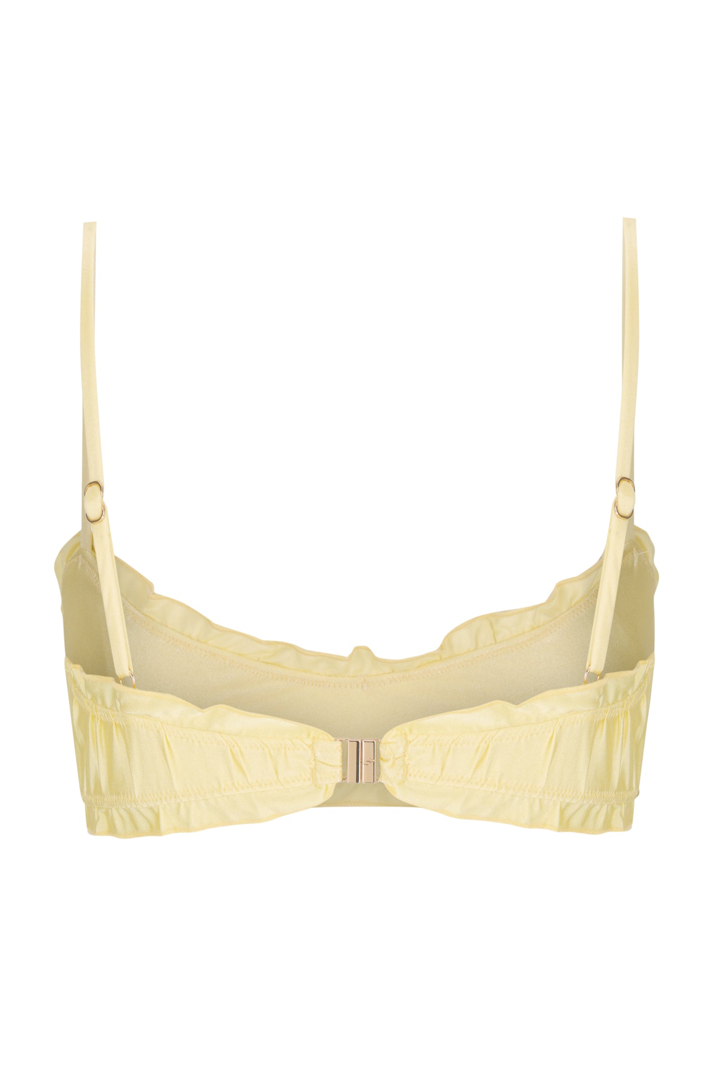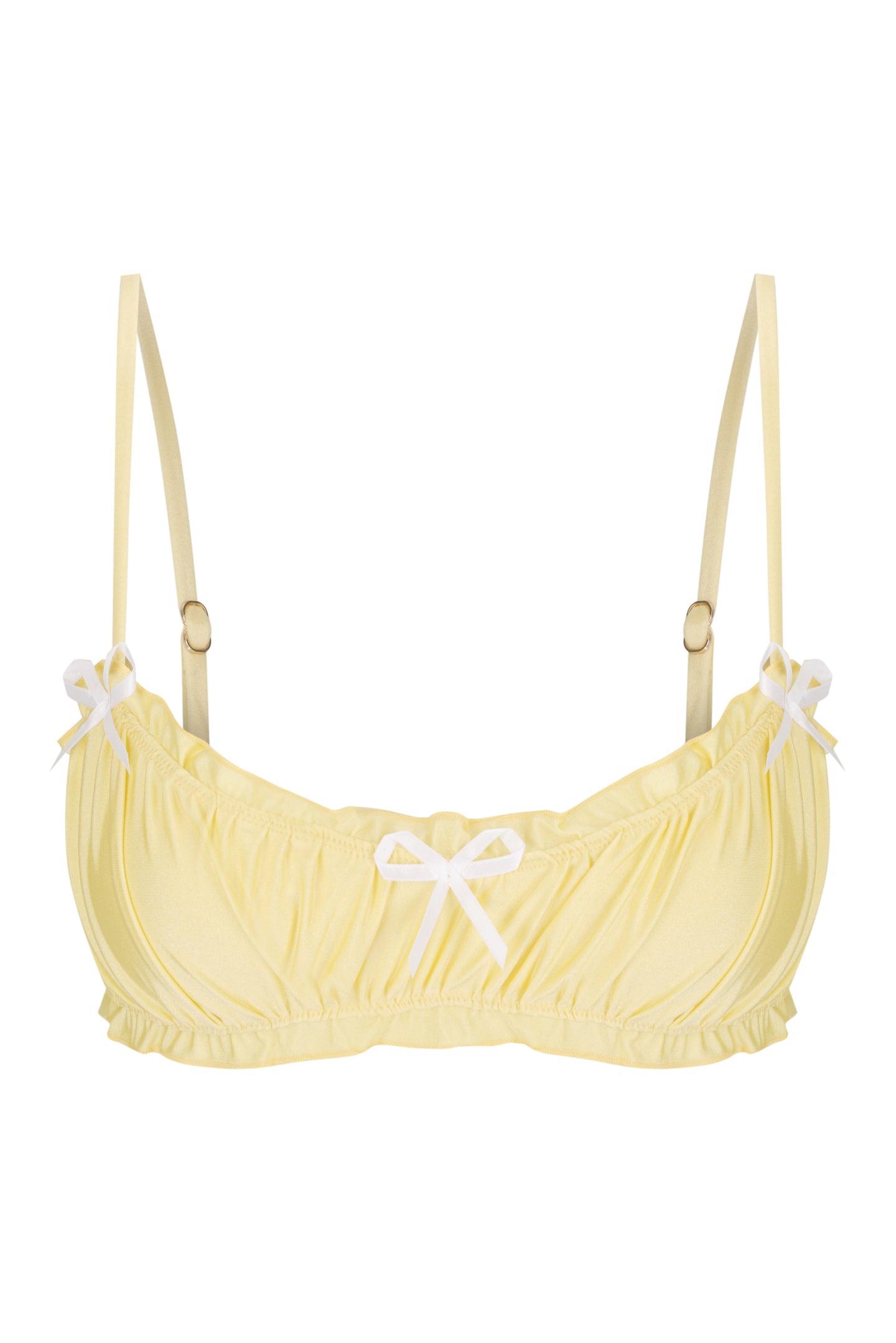Meet Amelia. This sexy bralette features a sensuous satin lycra material that hugs your curves while all-over ruching and cute bow details add sexiness and femininity.