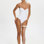 The Chiara One Piece, Featuring a curved balconette neckline with underwire cups, sculpting vertical seams, and a delicate satin bow, Chiara brings timeless elegance to sun-drenched celebrations.