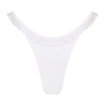 The Delia Bottom features a dipped front and delicate mesh frill. With a high-leg cut and moderate coverage, it’s a romantic take on a minimal shape.
