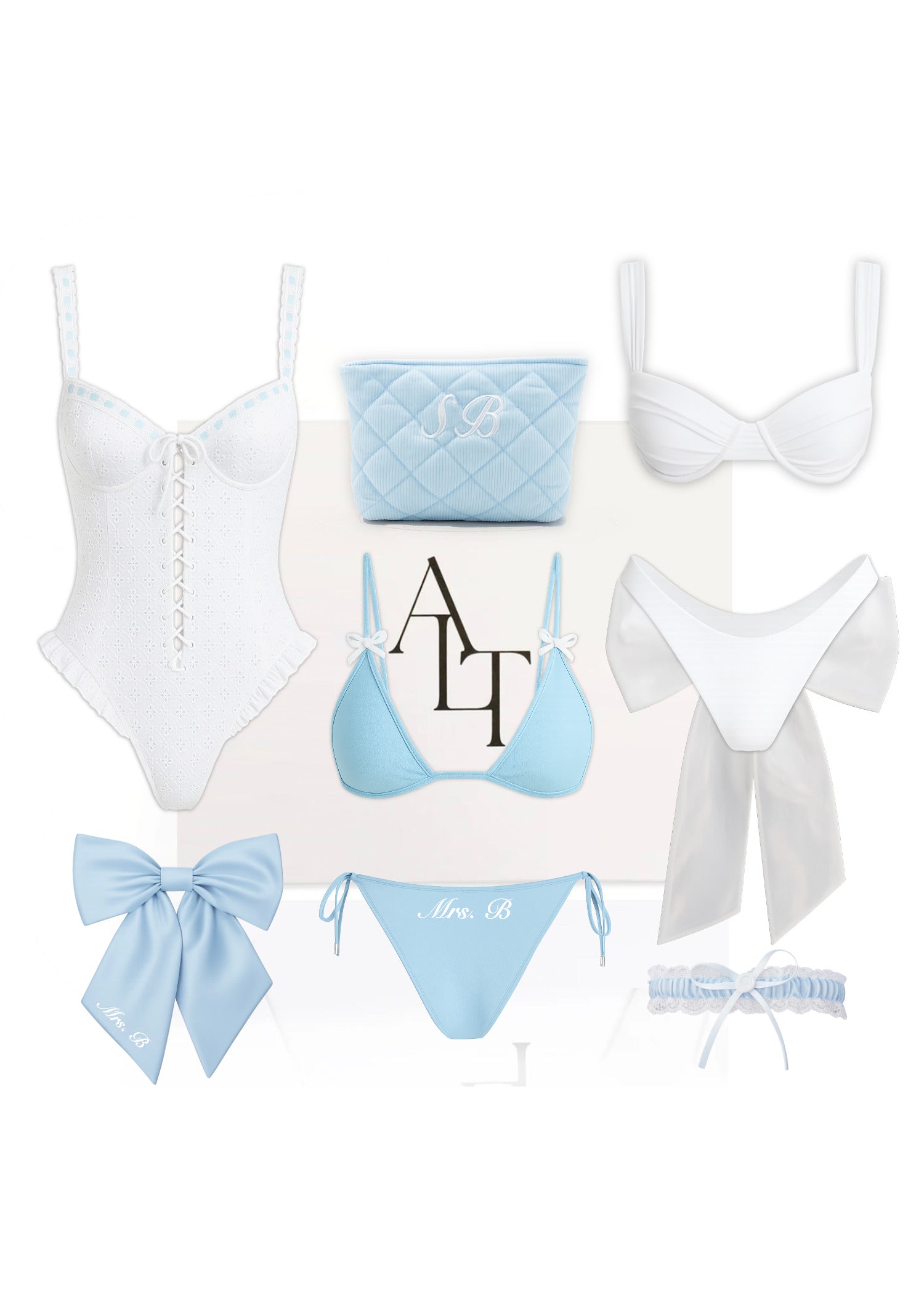 The Deluxe Blue Bundle brings together some of our most-loved pieces in one beautifully curated set. Designed to honour the tradition of something blue, each piece is thoughtfully chosen for wedding mornings, bachelorette celebrations, and honeymoon moments. With complimentary personalization included, this bundle becomes a meaningful keepsake made to be worn, cherished, and remembered long after the day itself.