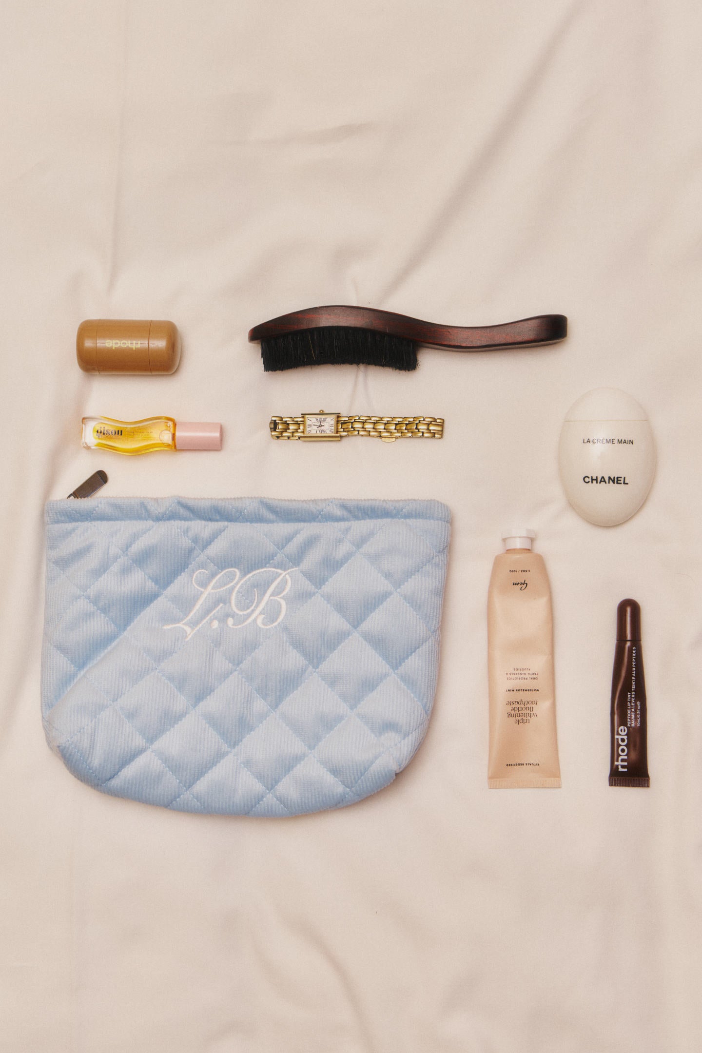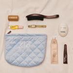 A dreamy little pouch for your prettiest essentials. The Elise Cosmetics Case is crafted from soft quilted corduroy suede in powder blue, finished with lining and personalised embroidery. Compact and travel-ready, it’s the perfect bridal accessory or thoughtful gift.