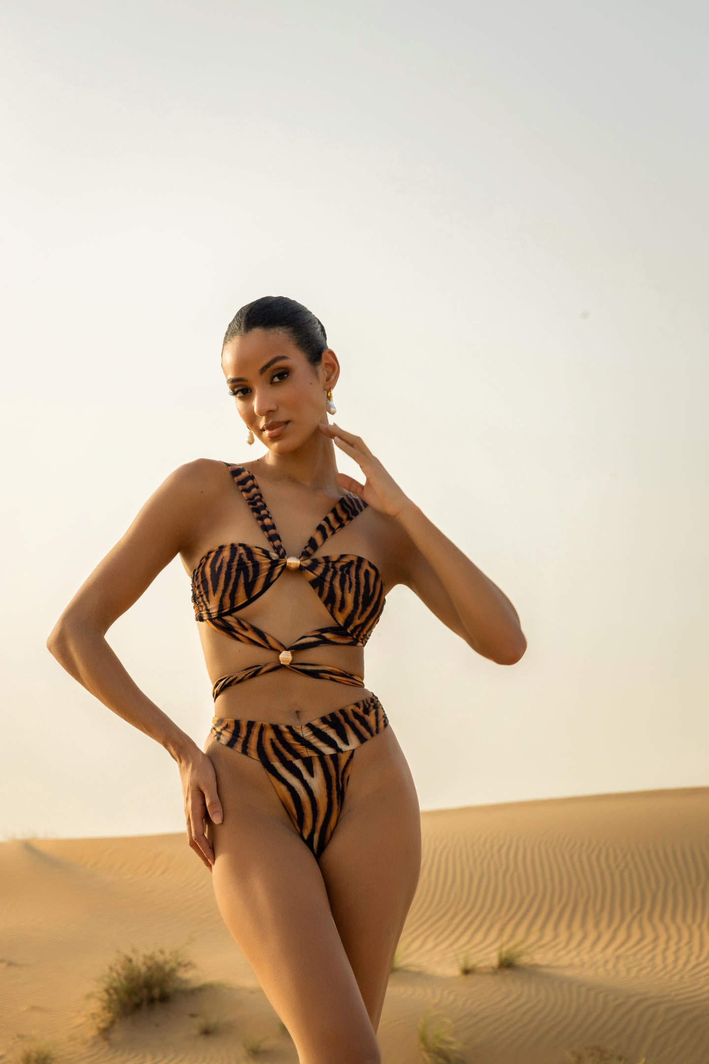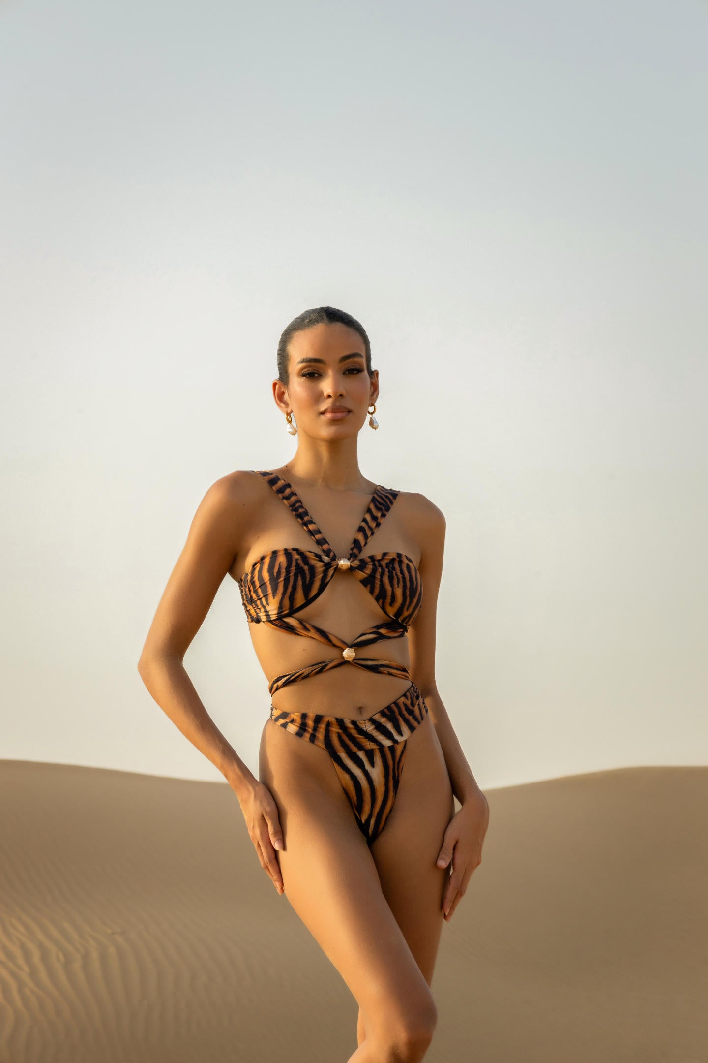 Cult Harlow One Piece in all new Tigress Print. Perfectly accented by custom gold bead hardware. Every detail has been crafted to maximize your confidence and exude elegance.
