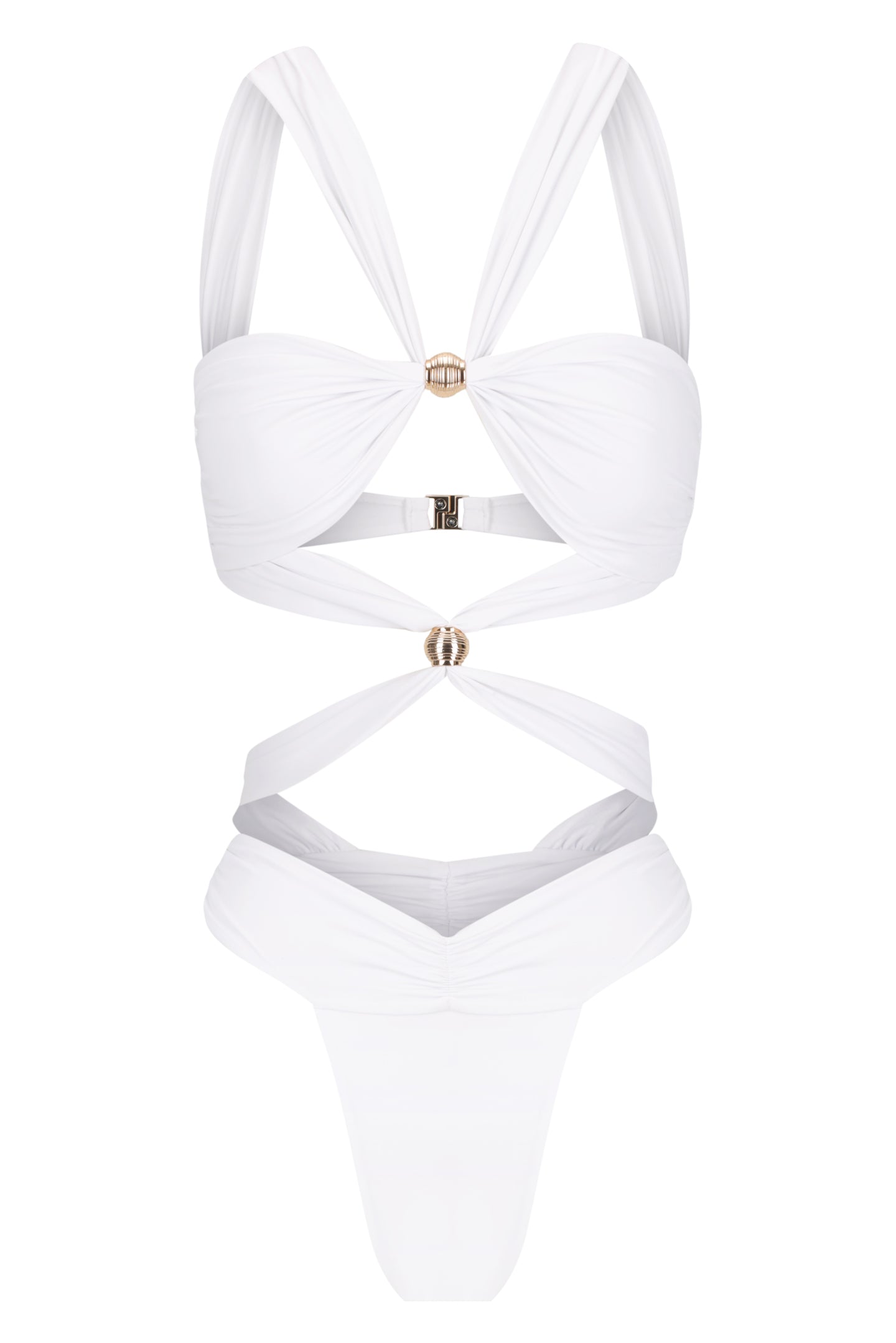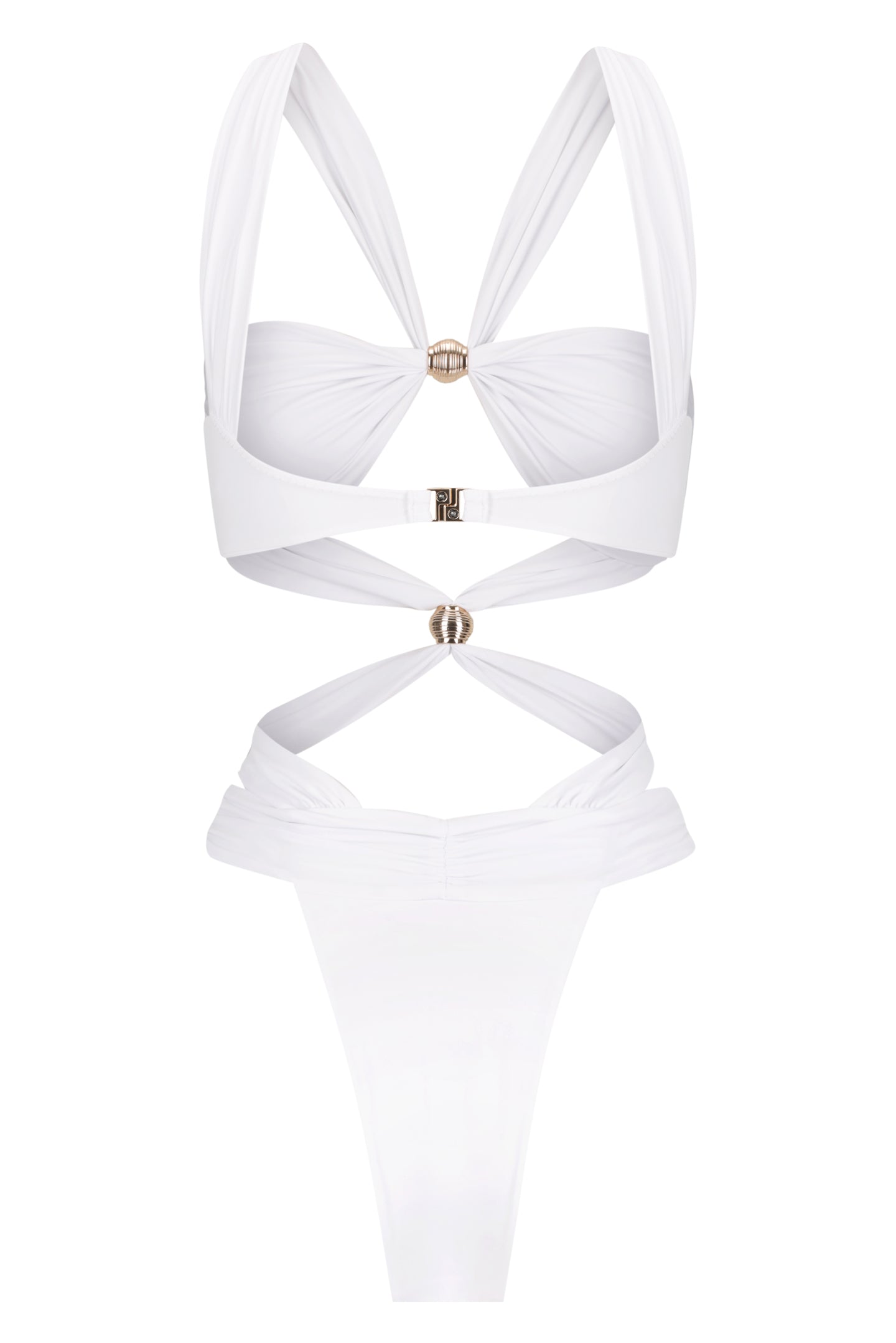 The Harlow One Piece features cutout panelling, crossover wrap details, and gold ring accents that create a striking, sculpted silhouette. Designed to contour and catch the eye, it’s a statement piece with modern edge.