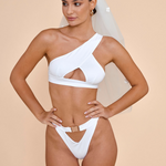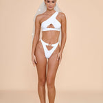 Rendered in fresh white that channels resort-luxe, the Moss One Shoulder Gold Buckle Top is a must-have in your swimwear repertoire. The trend spotted on all our fave IT-girls, this bikini top boasts cutaway detailing beneath the bust to flawlessly flaunt your figure. Whether your vacation vibe is cheeky, sporty or sultry, Moss can be mixed and matched with all of your ALT bottoms to suit your mood.