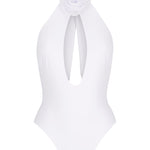 Make a statement with the Sadie One Piece, a halter neck swimsuit that blends graceful design with unique detailing. Featuring an exquisite mesh rose accent at the neckline and a flattering fit, this piece redefines refined swimwear.